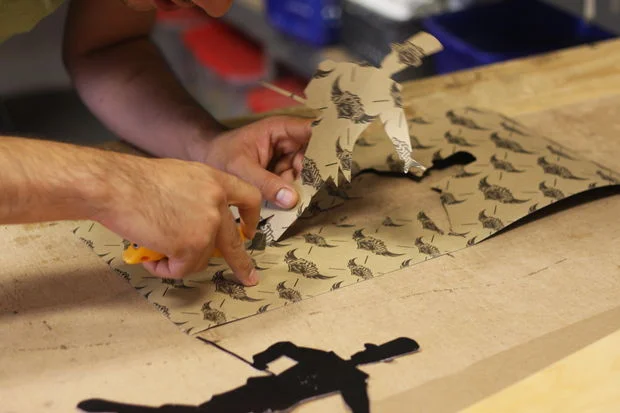 After taping our image to the back (paper) side of the grip tape, we start cutting out the areas we want the wood to show through.